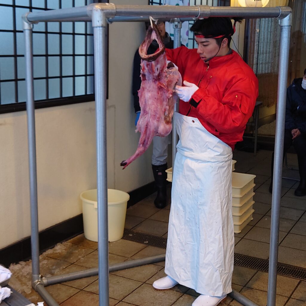 糸魚川の冬の味覚として親しまれている「あんこう」。 その魅力をより身近に感じていただけるよう、新潟県立海洋高校の生徒によるあんこうのつるし切り実演を行います。