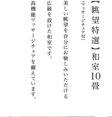 高機能マッサージチェアを備えたお部屋など、多彩なタイプをご用意しております。