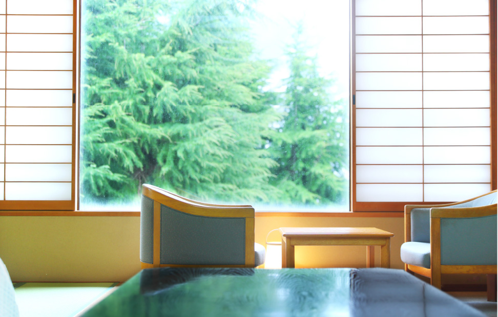和室の続き間にベッドのある洋室をご用意。和室からは雄大な山々と四季折々の季節の眺めをお愉しみいただけます。