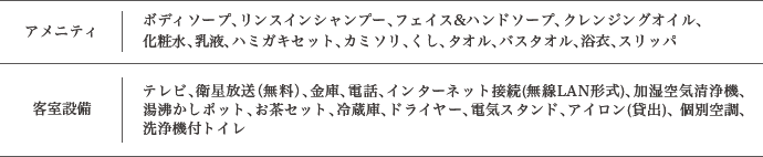 テレビ、衛星放送(無料)、金庫、電話、インターネット接続(無線LAN形式)、加湿空気清浄機、湯沸かしポット、お茶セット、冷蔵庫、ドライヤー、電気スタンド、アイロン(貸出)、 個別空調、洗浄機付トイレ